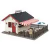 Geselliger Treffpunkt für eine kleine Pause auf dem Land! Das Modell überzeugt durch seine authentische Gestaltung mit heller Holzverkleidung, einem klassischen Satteldach mit dunklen Dachziegeln und einer markanten rot-weißen Markise über den großen Verkaufsfenstern. Durch die offene Theke blickt man direkt auf Flaschen, Gläser und kleine Snacks. Vor dem Kiosk sorgt der eingezäunte Biergarten mit weißen Gartenstühlen, Tischen und blau-weißem Sonnenschirm für gemütliche Atmosphäre. Liebevolle Details wie Getränkekisten, ein Zigarettenautomat und nostalgische Reklameschilder runden die Szene stimmungsvoll ab!